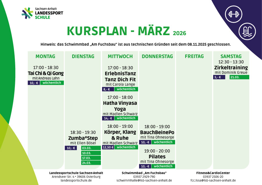 Der Frühling steht vor der Tür – die perfekte Zeit, um etwas für deine Gesundheit und dein Wohlbefinden zu tun! Ob Fitness, Entspannung oder neue sportliche Herausforderungen: In unserem März-Kursplan findest du vielfältige Angebote für jedes Level und jedes Ziel. Komm vorbei, probiere einen Kurs aus und erlebe, wie gut Bewegung tut. Wir freuen uns auf dich!Â