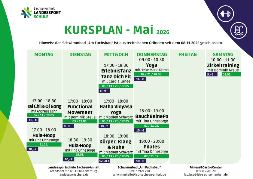 Der Mai bringt frische Luft, längere Tage und neue Lust auf Aktivität. Genau der richtige Moment, um deinem Körper etwas Gutes zu tun! An der Landessportschule Sachsen‑Anhalt in Osterburg erwartet dich ein abwechslungsreicher Kursplan mit vielen Möglichkeiten, aktiv zu werden – reinschnuppern, ausprobieren, durchstarten. Unsere Kurse bieten dir Bewegung, Motivation und Spaß in der Gemeinschaft.